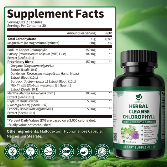 Chlorophyll Herbal Complex Capsules for Detox, Digestion, Gut & Skin Health, Energy & Immune Support-60 CT