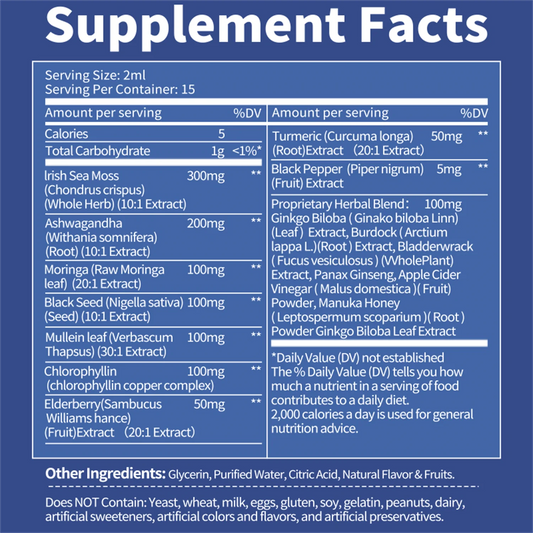 Sea Moss Liquid Drops – Irish Sea Moss with Ashwagandha, Moringa, Black Seed, Mullein Leaf, Chlorophyllin, Elderberry Extract | 2 Fl Oz