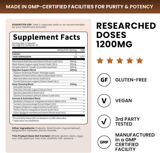 Wormwood Black Walnut Cleanse 1200mg – 16-in-1 Ultra Gut Cleanse & Detox Formula with Pumpkin Seed Oil, Clove & Activated Charcoal | 10X Concentrated, 60 Vagan Capsules