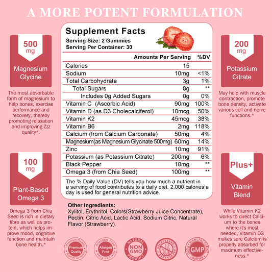 Potassium Magnesium Gummies - High Absorption Magnesium Glycinate 500mg & Potassium Citrate 200mg & Omega 3, B6, D3, K2 & Calcium - Chewable Gummy for Leg Cramps, Immunity & Energy - 60 Count