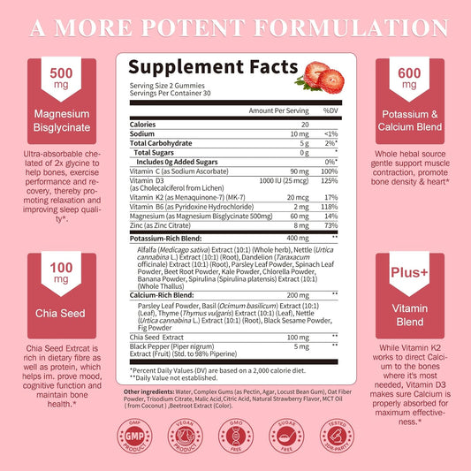 Magnesium Gummies - High Absorption Magnesium Glycinate 500mg & Potassium Citrate 200mg Plus Omega 3, B6, D3, K2 & Calcium - Chewable Gummy for Leg Cramps, Calm Mood & Energy - 60 Count
