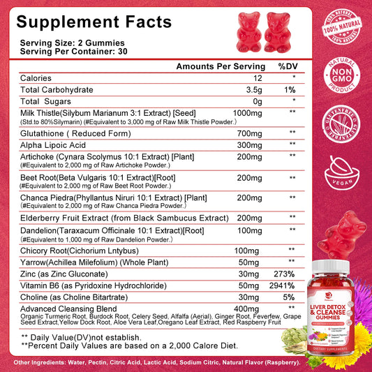 Liver Cleanse Detox & Repair Gummies - 24 Potent Herb w/ 1000mg Milk Thistle Silymarin, Dandelion, Artichoke Extract & Elderberry - No Sugar, Raspberry Flavor -60 Count