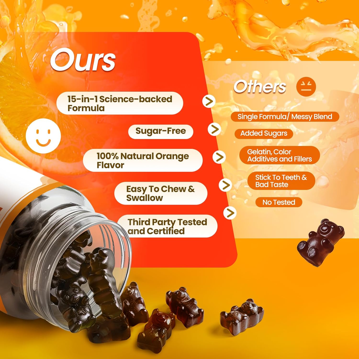 Our gummies are vegan, non-GMO and sugar-free, flavored naturally with orange. They contain no gluten, soy, dairy, nuts, artificial colors, preservatives or fillers — gentle on the stomach and suitable for daily use.