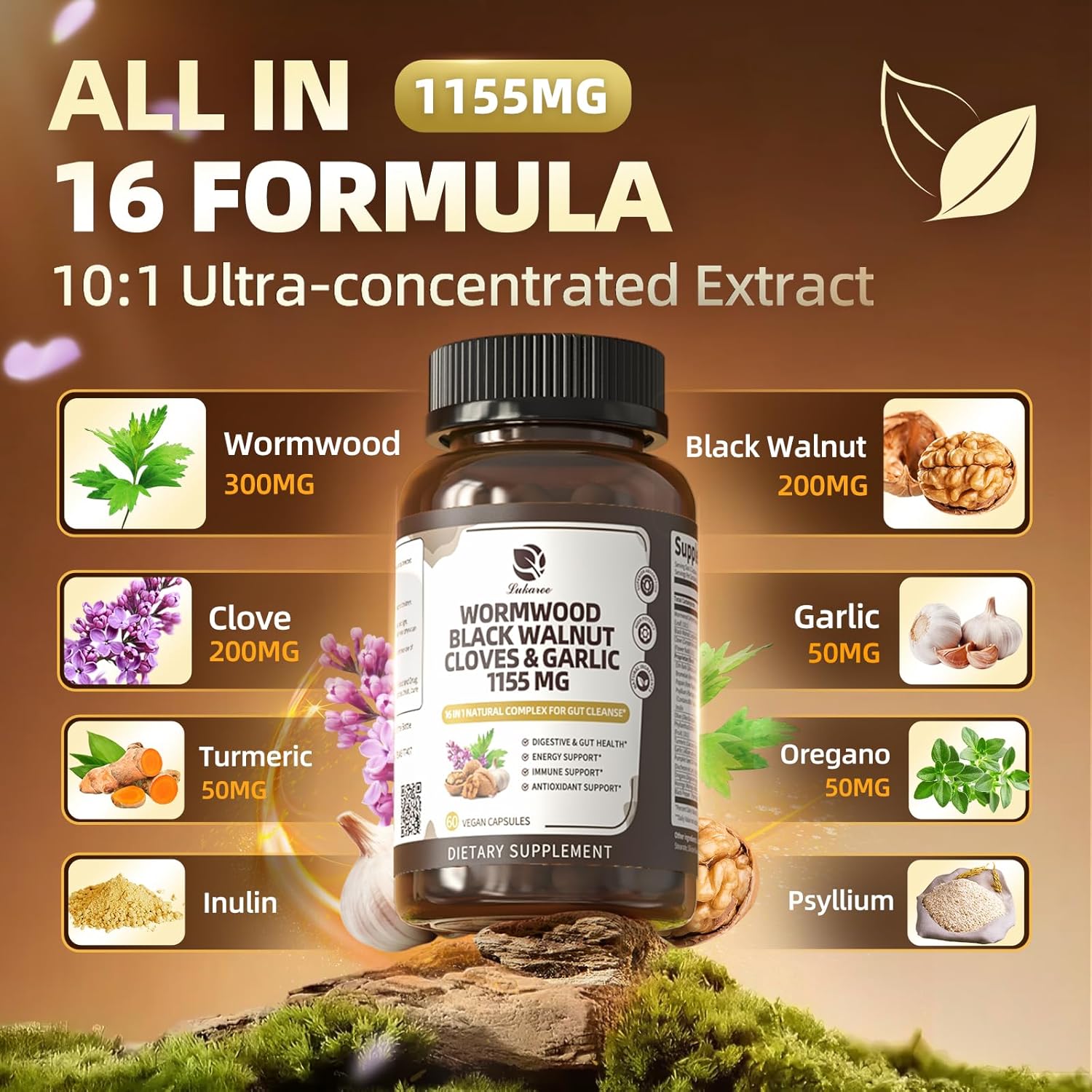 16-in-1 Wormwood & Black Walnut Capsules – Gut Cleanse & Digestive Health Support | Liposomal Delivery, 98% Absorption | Vegan, Gluten-Free – 1155mg