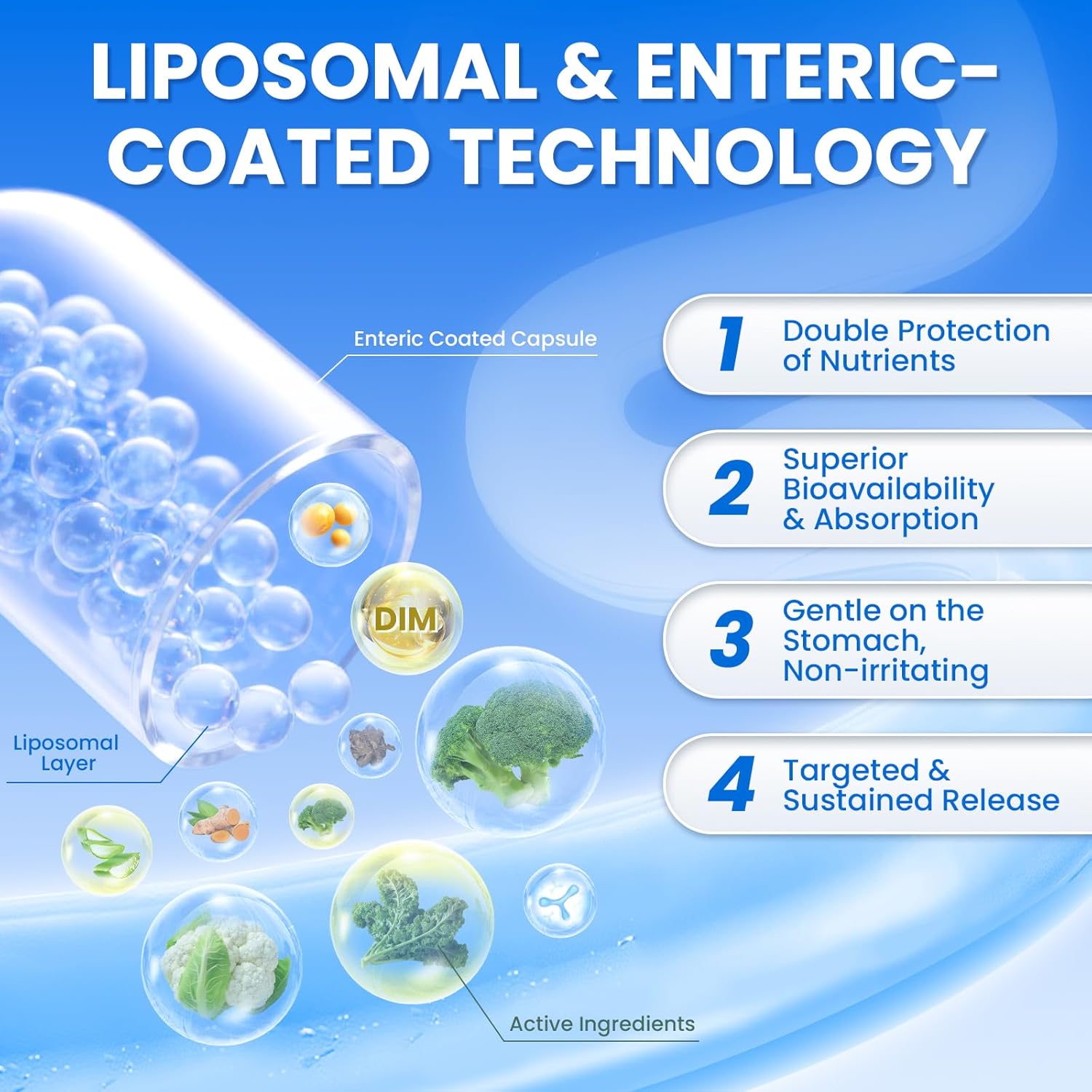Liposome encapsulation and enteric-coated capsules ensure slow, stable release for maximum absorption without stomach discomfort.*