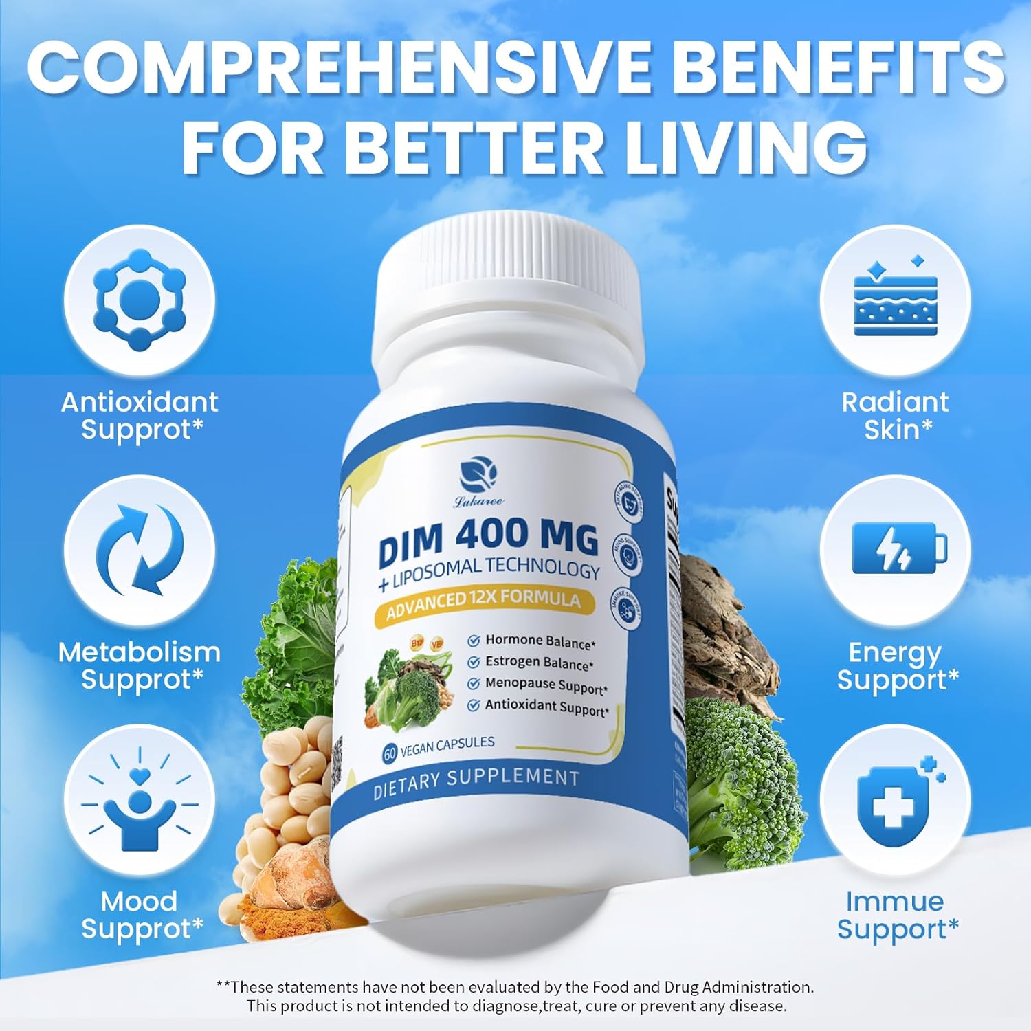 Lukaree DIM Supplement 400MG for Women, Liposomal - Estrogen Support & Antioxidant Support - with Black Cohosh, Soy Isoflavones & Alpha Lipoic Acid - Vegan, 60 Ct.